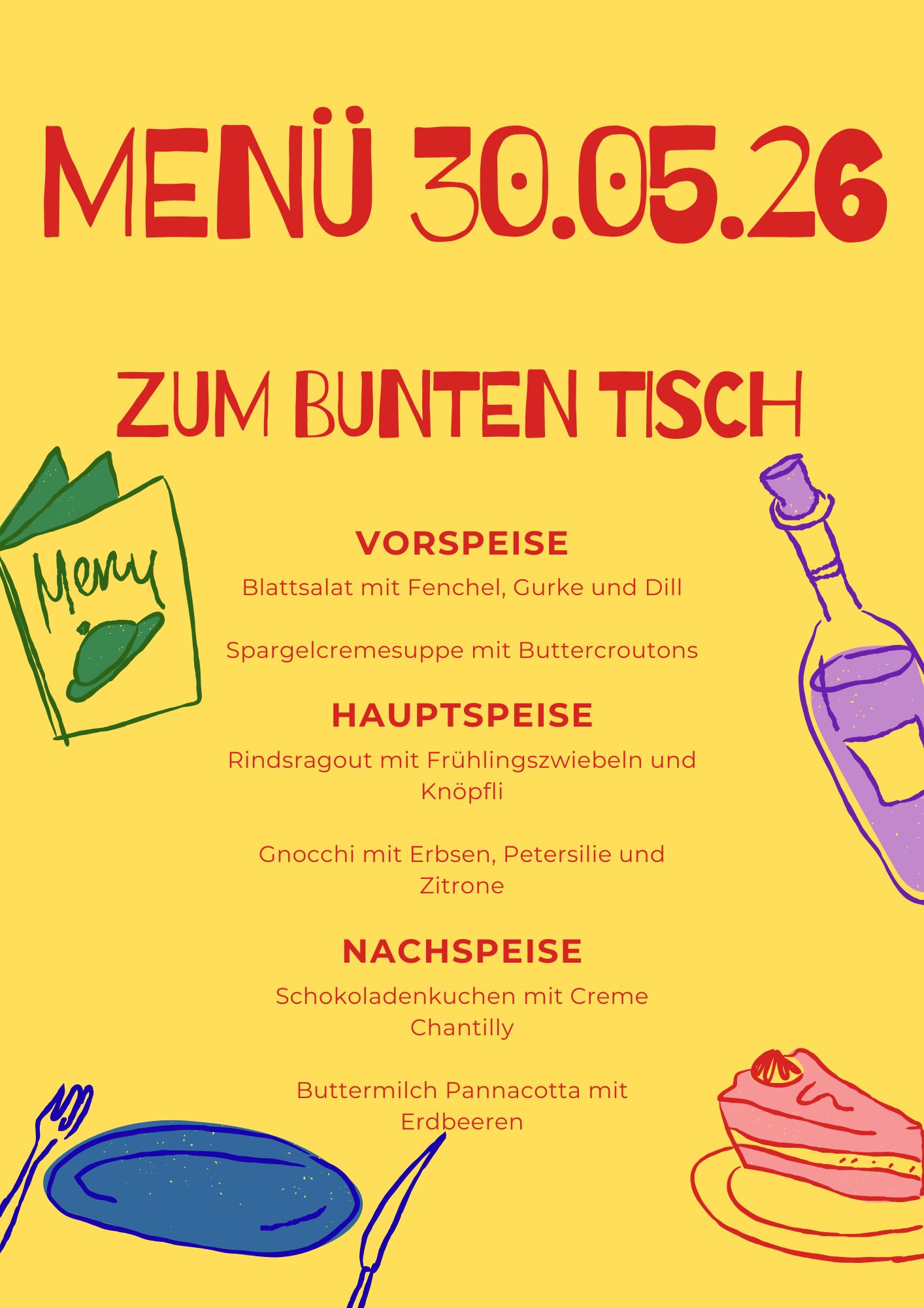 Wir freuen uns sehr, dass wir jemanden finden konnten, der sich allenfalls vorstellen könnte, die Rolle als Koch/Köchin beim Bunten Tisch zu übernehmen. Aus diesem Grund findet am 30. Mai ein Probeabend statt. Sichere dir noch heute deinen Platz, unter folgendem Link: